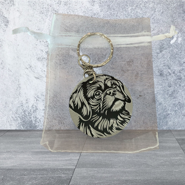 This is an Aluminium Dog Keyring Laser Engraved with the image of a Pug. It is black in colour and made of aluminium. The keyring features a circular design, perfect for dog lovers and collectors. Comes Complete with a Gift Pouch.