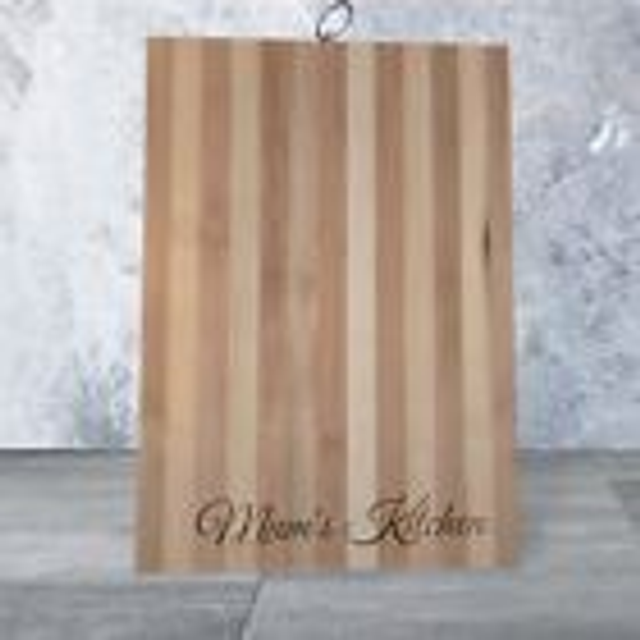 This is a rectangular wood cutting board measuring 13.24 inches by 9.25 inches with a thickness of 0.5 inches. It is designed for chopping and serving in the kitchen and is Laser Engraved with "Mum's Kitchen."